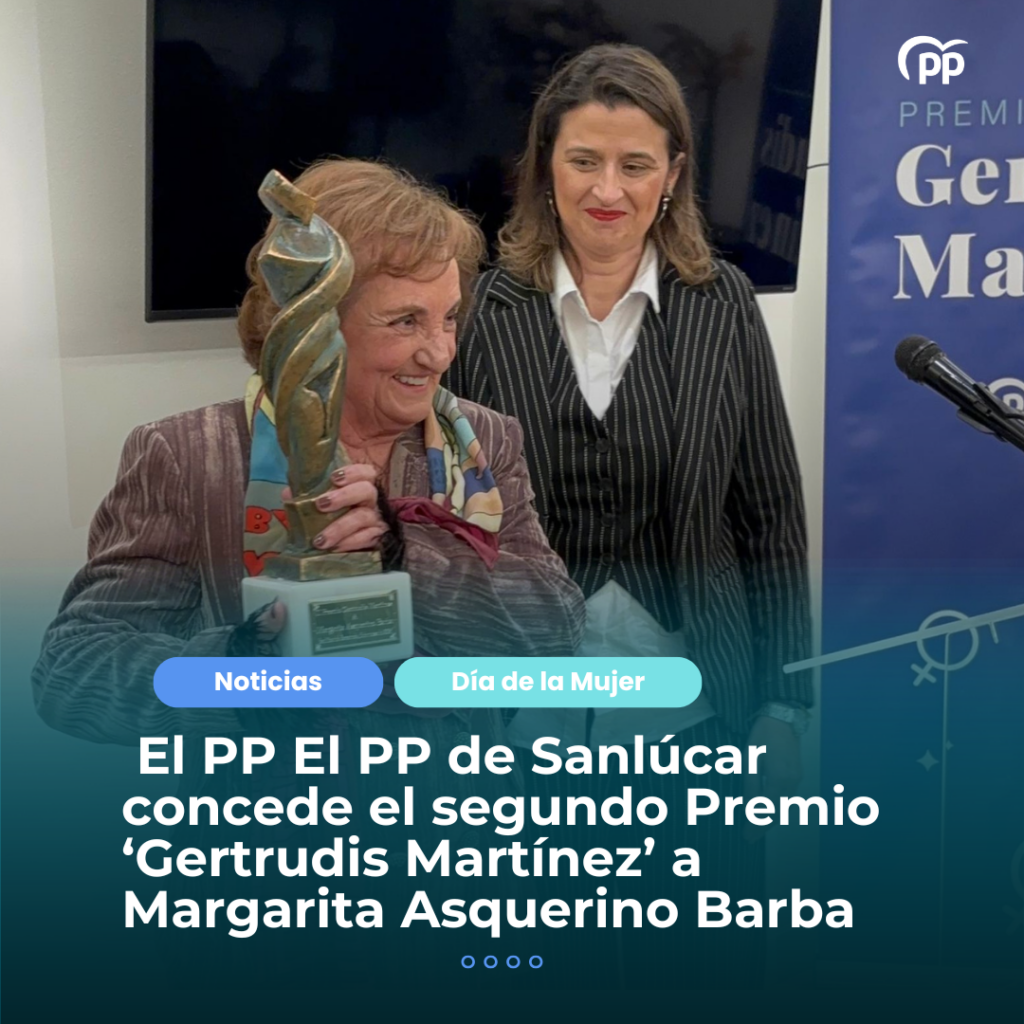 Sanlúcar de Barrameda, 06 de marzo 2026. El PP de Sanlúcar concede el segundo Premio ‘Gertrudis Martínez’ a Margarita Asquerino Barba. 🔹El galardón toma el nombre de Gertrudis Martínez, primera mujer en cursar los estudios de Farmacia y desarrollar la actividad de forma pionera en Andalucía. 🔹Margarita Asquerino, popularmente conocida por su papel de Logi […]