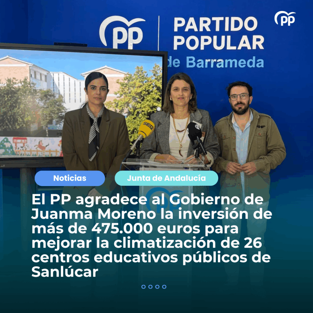 Sanlúcar de Barrameda, 17 de noviembre de 2025. El PP agradece al Gobierno de Juanma Moreno la inversión de más de 475.000 euros para mejorar la climatización de 26 centros educativos públicos de Sanlúcar. 🔹La presidenta del PP de Sanlúcar y portavoz municipal, Carmen Pérez, destaca que los fondos permitirán instalar toldos o porches, crear […]